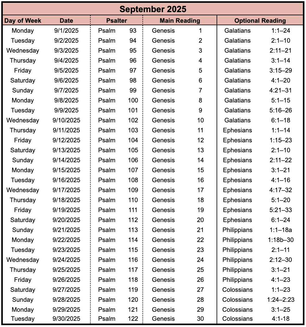 In the past, the plan has consisted of three readings: a Psalm, an Old Testament passage, and a New Testament passage each day. But many have found that three readings per day is too much. If you get behind, it can feel hard to catch back up, and then maybe you just give up altogether. On that note, I’d like to suggest a couple ways to make it more sustainable. First, if you get really behind, DON’T “catch up.” Just do the reading assigned to that day. Second, and particularly relevant for this month, our philosophy is “baby steps” toward healthier spiritual rhythms. So we are officially scaling back the standard reading plan from three passages to just two (with an optional third). This month, besides the typical Psalter, we will concentrate on the Book of Genesis. For anyone still in the early stages of forming healthy habits, I suggest you ONLY read the Psalm and the Genesis passage. But for those who have been following along for a while, I’ve included an optional New Testament passage which you can add as you see fit. Remember, baby steps is best. If you can’t do all three readings sustainably, seriously, just do the two.