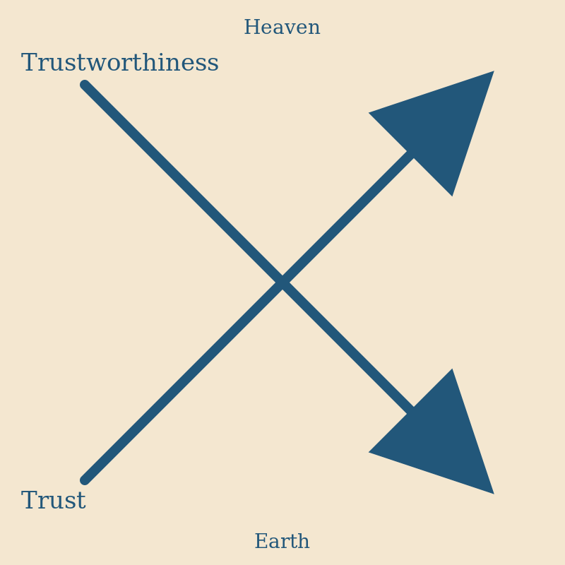 One way to appreciate the thickness of the biblical word faith is to incorporate both meanings simultaneously. Pistis, then, means something like faith-plus-faithfulness or trust-meets-trustworthiness, faithful faith and trustworthy trust, trust that proves itself able to be trusted. You may recall that in past essays, I have depicted Trustworthiness as a descending phenomenon, making the inaccessible meaning and certainty of heaven real and accessible on earth, and Trust as an ascending capacity to appreciate and count on the truth, beauty, goodness, or wholeness of a thing, despite its lack of certainty from our earthly vantage. Now, if that is the case, pistis can be understood as the center of the X, the faculty for discerning, inviting, and participating in the meeting of heaven and earth in our daily lives.